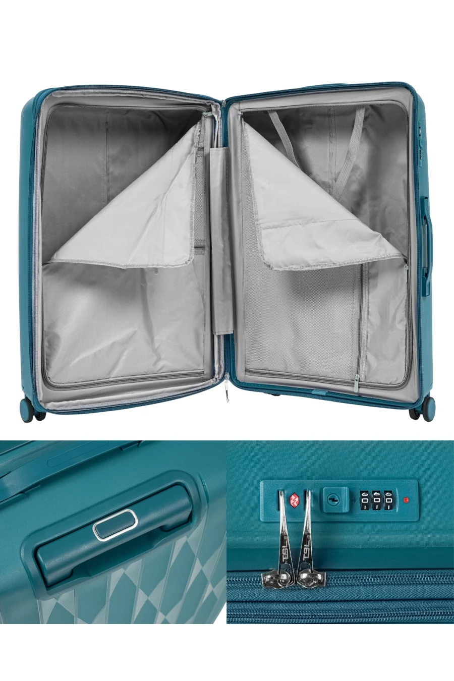Комплект из двух чемоданов "TSL"-TOURISSTERLUGGAGE из ударопрочного полипропилена отличаются от других своим функциональным наполнением внутри с двумя разделителями на молнии что при раскрывании не позволит вещам вываливаться из отделений. Левое отделение имеет текстильный ремень для стягивания багажа. Множество карманов на правой перегородке выполняют роль органайзера- добавлено влагозащищенное отделение для документов. Выдвижная телескопическая ручка выполнена из авиационного алюминия - что придаёт высокую прочность и снижает вес чемодана. Основная молния закрывания отделений имеет 2-х рядную структуру витков пластика- что делает невозможным непроизвольное открытие чемодана во время транспортировки и перегрузки. Все чемоданы - независимо от размера имеют расширение по кругу- что добавляет 20% дополнительного пространства для ваших вещей. Закрывание чемодана осуществляется на кодовый замок с функцией TSA.