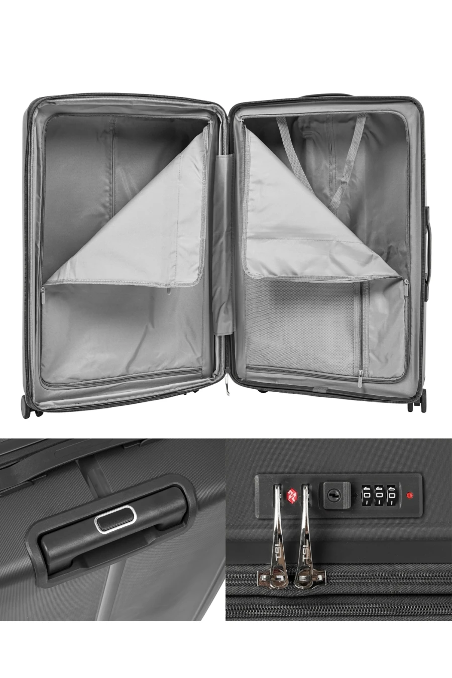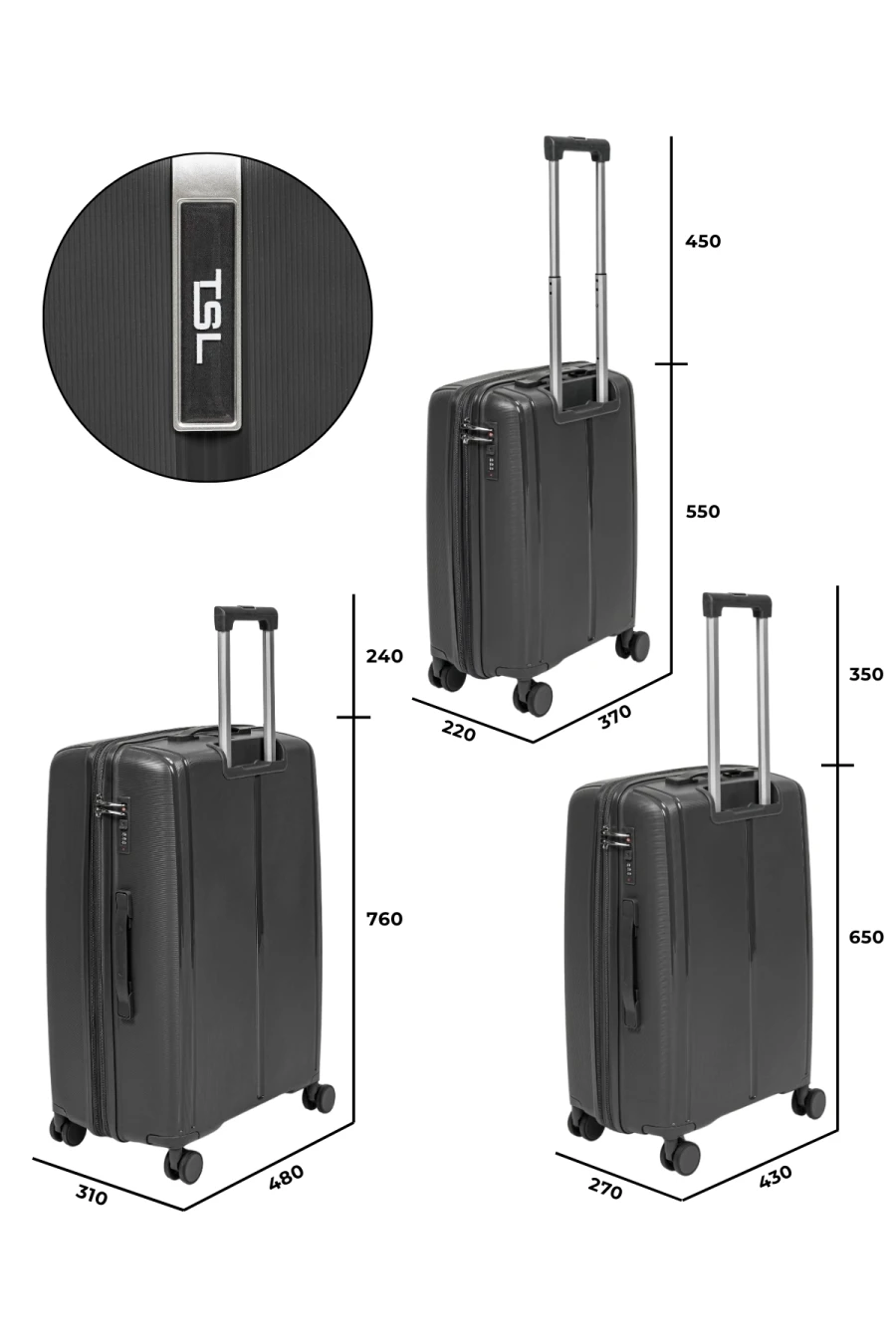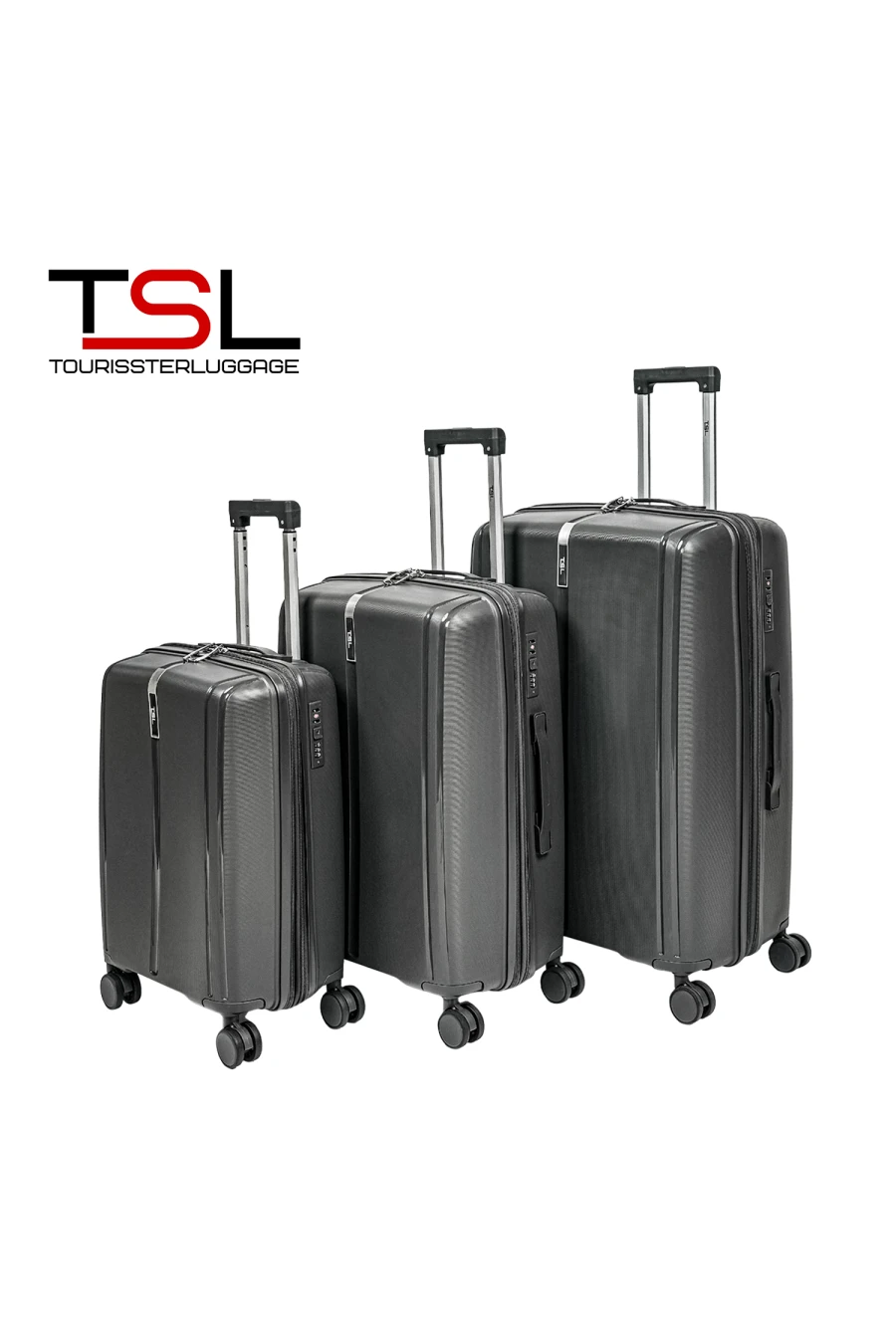 Комплект из трех чемоданов "TSL"-TOURISSTERLUGGAGE всех размеров из ударопрочного полипропилена отличаются от других своим функциональным наполнением внутри с двумя разделителями на молнии что при раскрывании не позволит вещам вываливаться из отделений. Левое отделение имеет текстильный ремень для стягивания багажа. Множество карманов на правой перегородке выполняют роль органайзера- добавлено влагозащищенное отделение для документов. Выдвижная телескопическая ручка выполнена из авиационного алюминия - что придаёт высокую прочность и снижает вес чемодана. Основная молния закрывания отделений имеет 2-х рядную структуру витков пластика- что делает невозможным непроизвольное открытие чемодана во время транспортировки и перегрузки. Все чемоданы - независимо от размера имеют расширение по кругу- что добавляет 20% дополнительного пространства для ваших вещей. Закрывание чемодана осуществляется на кодовый замок с функцией TSA.