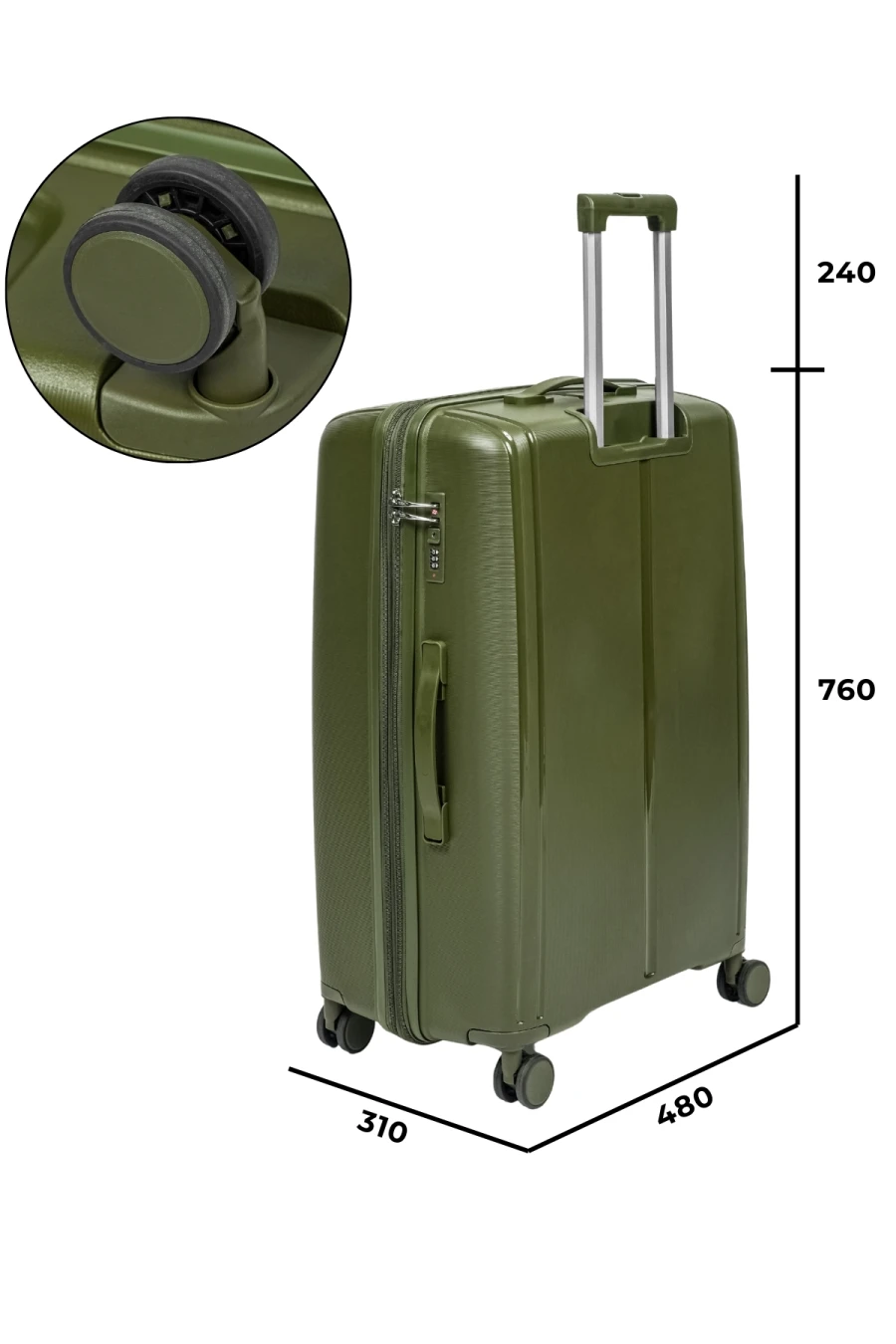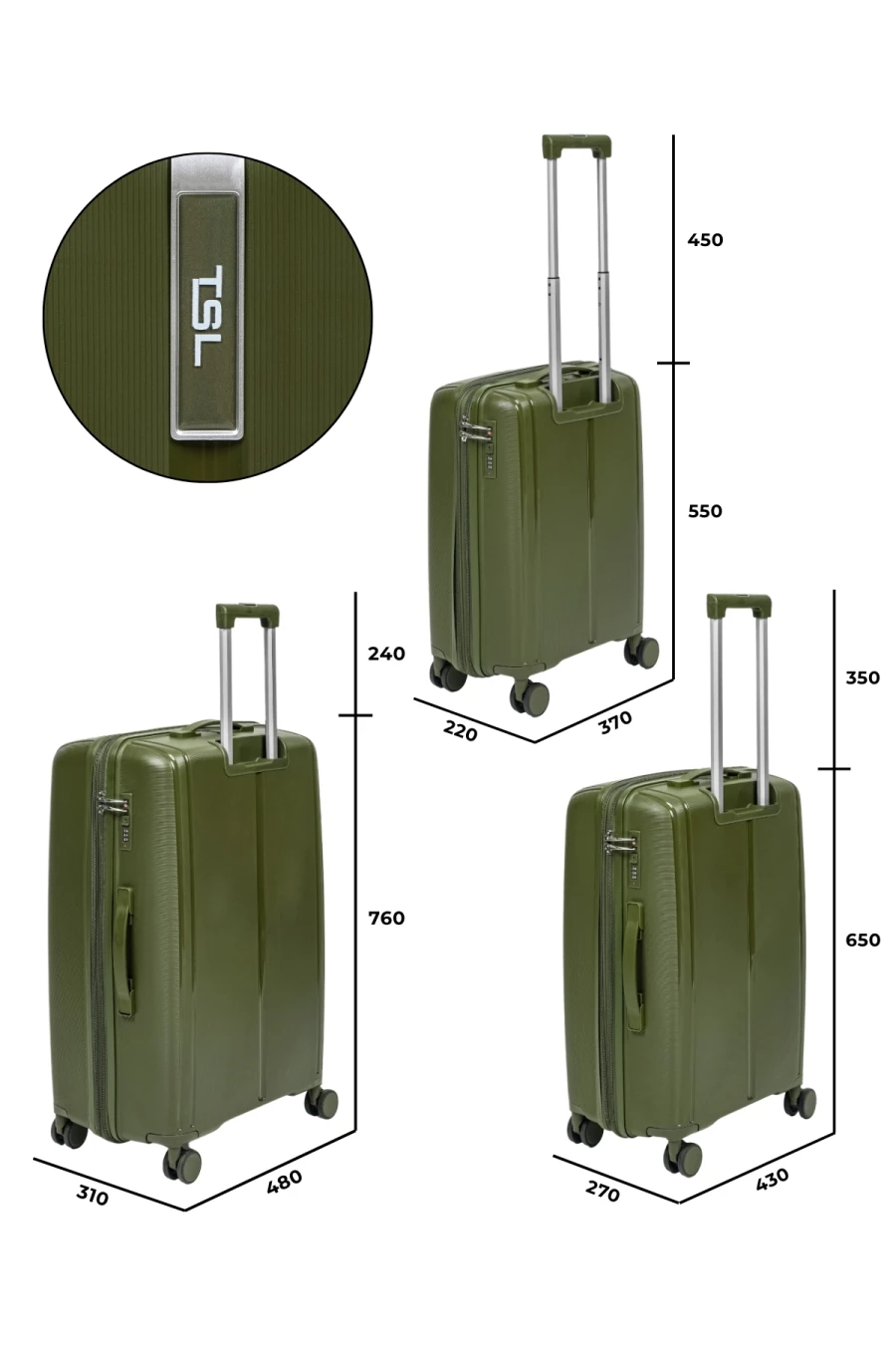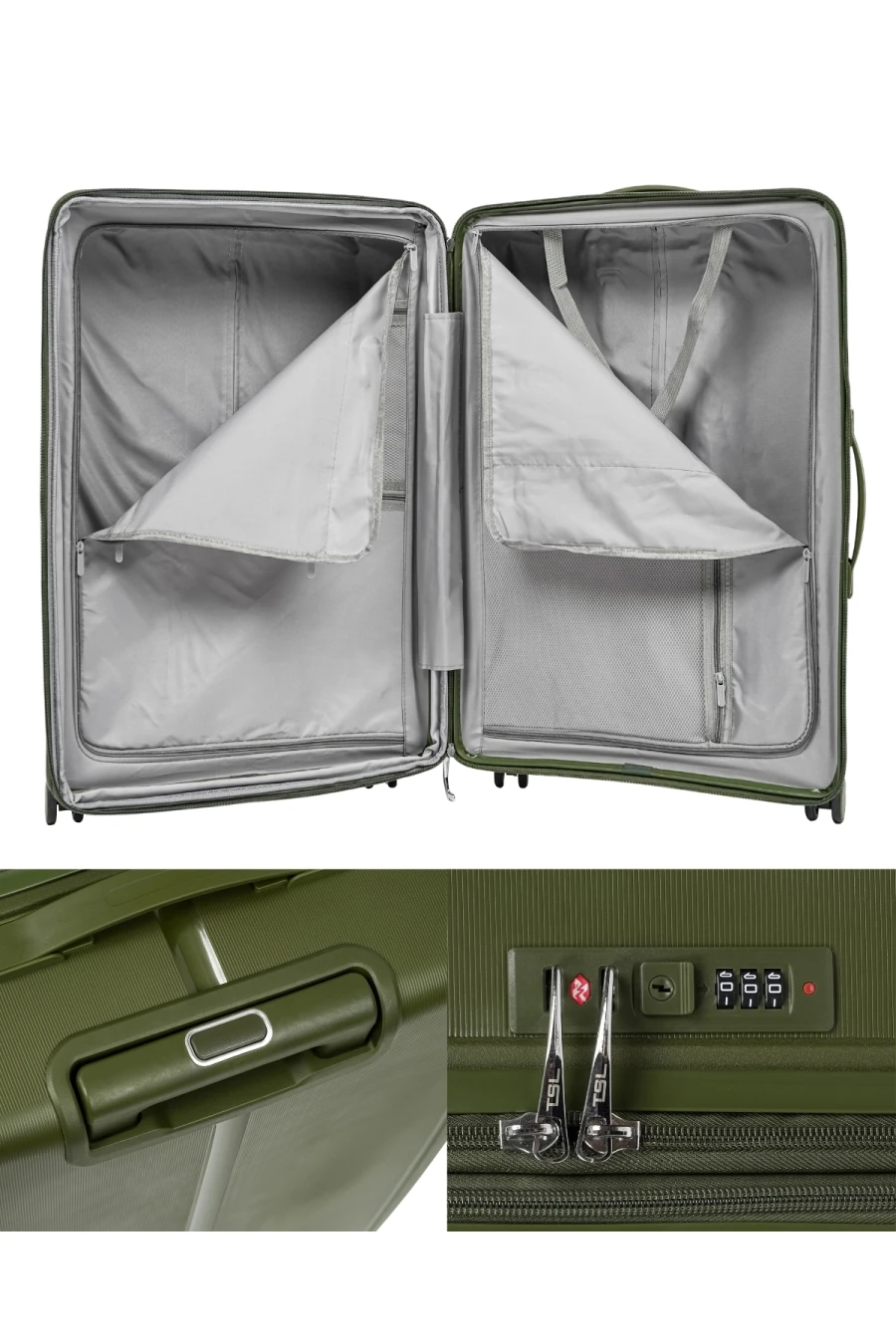 Комплект из трех чемоданов "TSL"-TOURISSTERLUGGAGE всех размеров из ударопрочного полипропилена отличаются от других своим функциональным наполнением внутри с двумя разделителями на молнии что при раскрывании не позволит вещам вываливаться из отделений. Левое отделение имеет текстильный ремень для стягивания багажа. Множество карманов на правой перегородке выполняют роль органайзера- добавлено влагозащищенное отделение для документов. Выдвижная телескопическая ручка выполнена из авиационного алюминия - что придаёт высокую прочность и снижает вес чемодана. Основная молния закрывания отделений имеет 2-х рядную структуру витков пластика- что делает невозможным непроизвольное открытие чемодана во время транспортировки и перегрузки. Все чемоданы - независимо от размера имеют расширение по кругу- что добавляет 20% дополнительного пространства для ваших вещей. Закрывание чемодана осуществляется на кодовый замок с функцией TSA.
