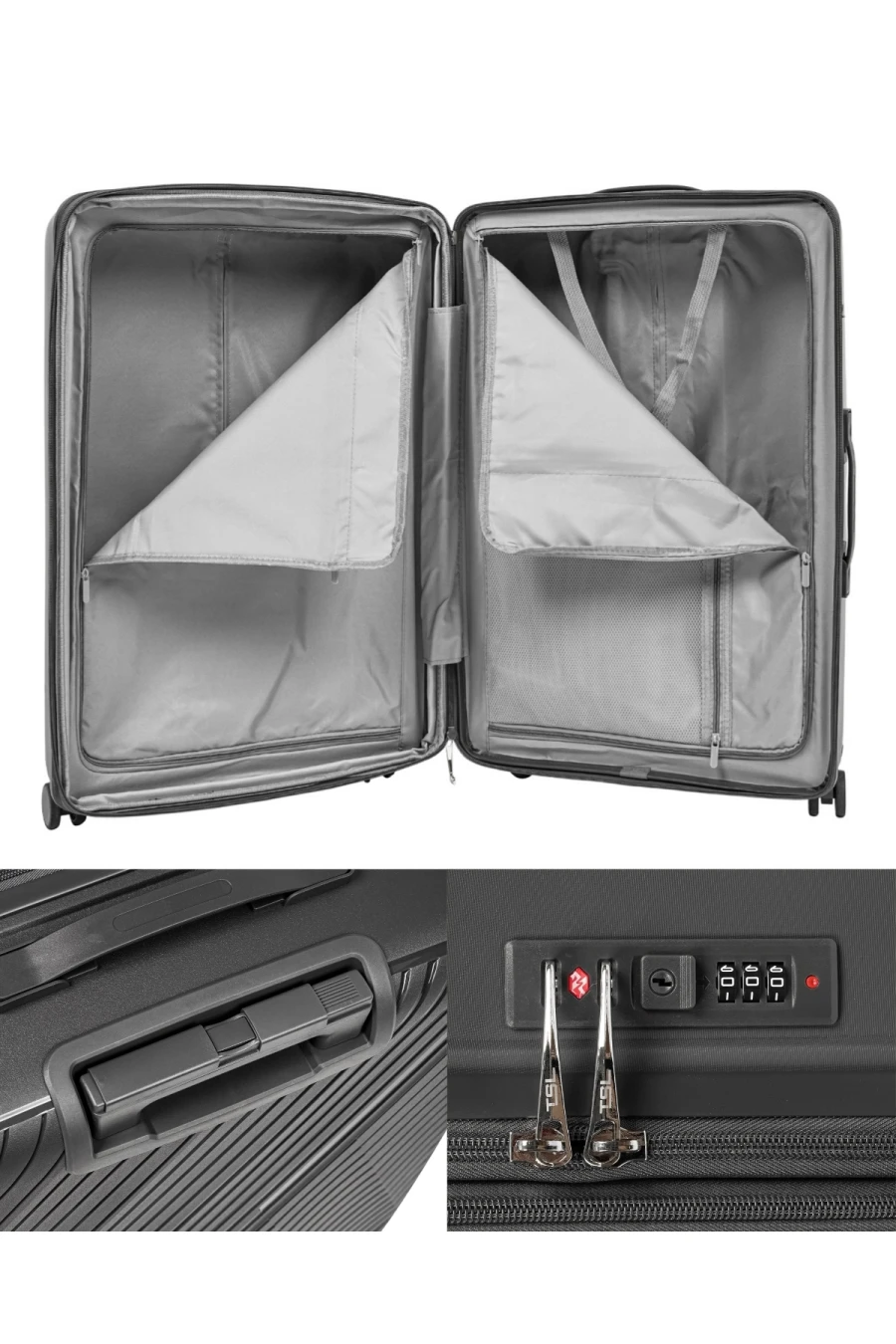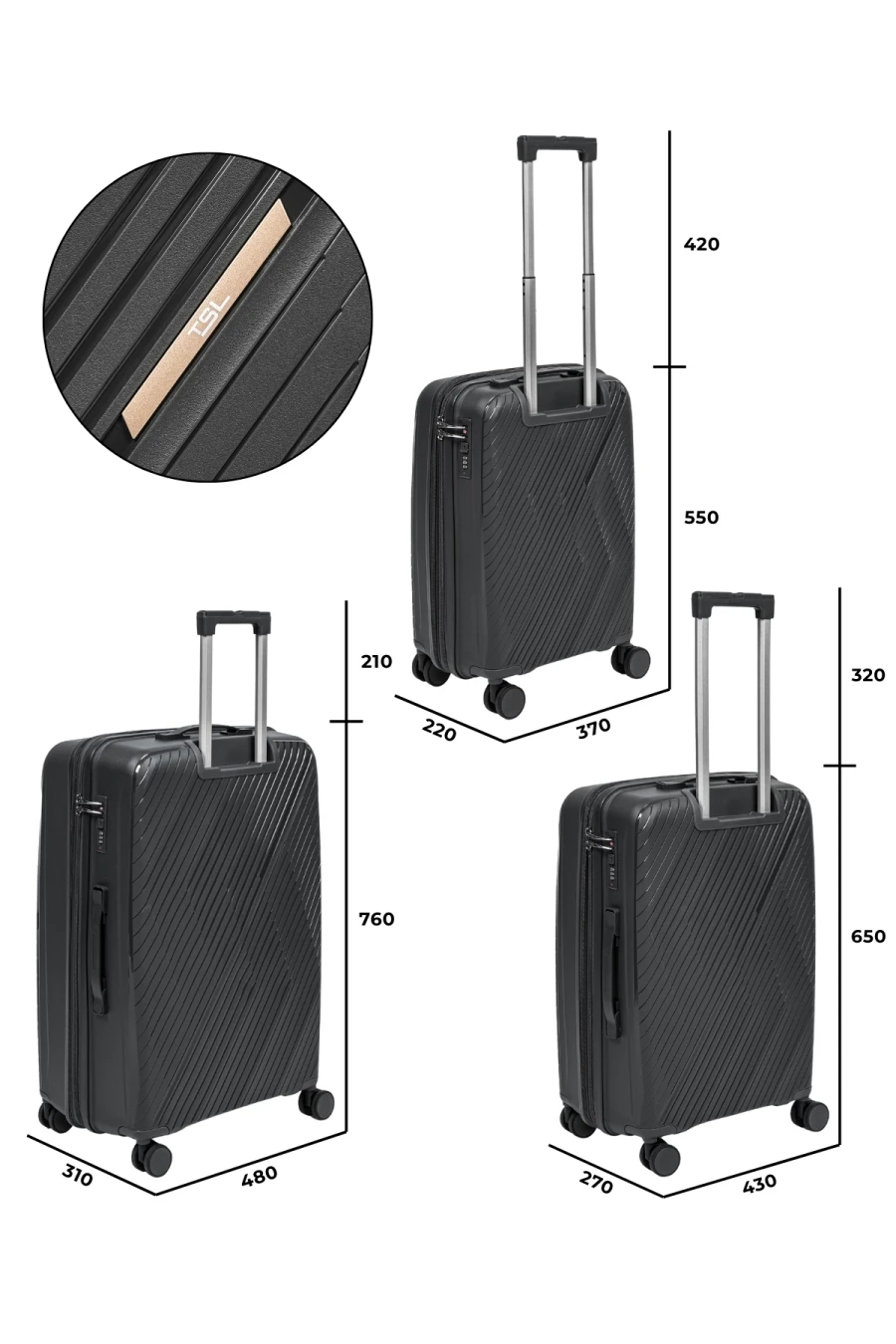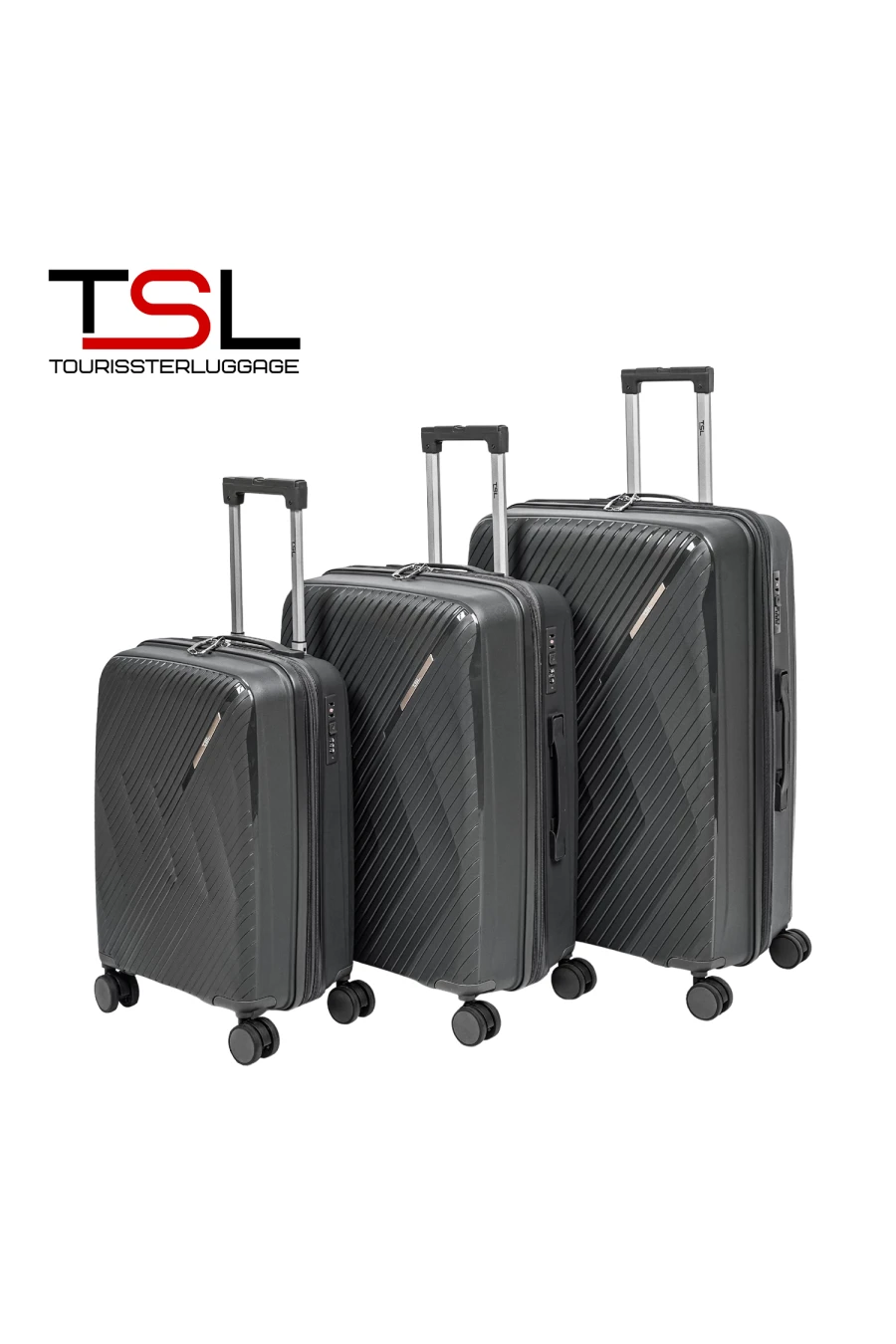 Комплект из трех чемоданов "TSL"-TOURISSTERLUGGAGE всех размеров из ударопрочного полипропилена отличаются от других своим функциональным наполнением внутри с двумя разделителями на молнии что при раскрывании не позволит вещам вываливаться из отделений. Левое отделение имеет текстильный ремень для стягивания багажа. Множество карманов на правой перегородке выполняют роль органайзера- добавлено влагозащищенное отделение для документов. Выдвижная телескопическая ручка выполнена из авиационного алюминия - что придаёт высокую прочность и снижает вес чемодана. Основная молния закрывания отделений имеет 2-х рядную структуру витков пластика- что делает невозможным непроизвольное открытие чемодана во время транспортировки и перегрузки. Все чемоданы - независимо от размера имеют расширение по кругу- что добавляет 20% дополнительного пространства для ваших вещей. Закрывание чемодана осуществляется на кодовый замок с функцией TSA.